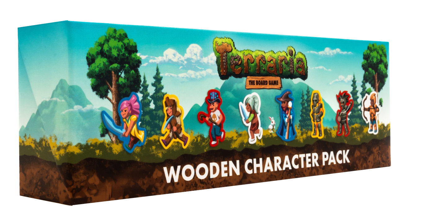 Pack de personajes en madera para Terraria: The Board Game, diseñado para sustituir los meeples estándar por figuras personalizadas y temáticas. Cada pieza representa a los personajes jugables con arte pixelado grabado, aportando un toque premium y coleccionable.